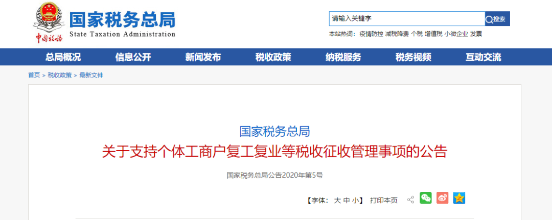 《國家稅務(wù)總局關(guān)于支持個體工商戶復(fù)工復(fù)業(yè)等稅收征收管理事項的公告》(2020年第5號)