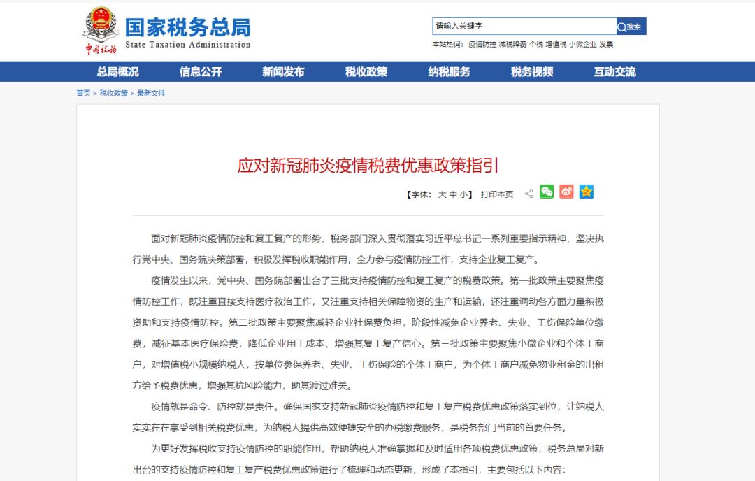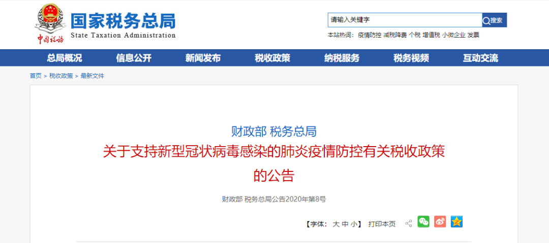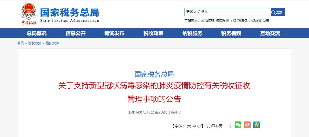 《國家稅務(wù)總局關(guān)于支持新型冠狀病毒感染的肺炎疫情防控有關(guān)稅收征收管理事項的公告》(2020年第4號)