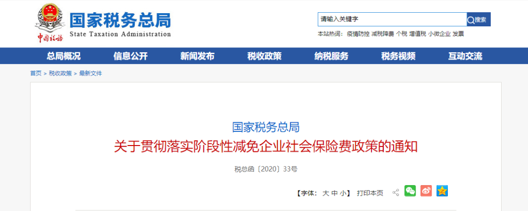 《國家稅務(wù)總局關(guān)于貫徹落實階段性減免企業(yè)社會保險費(fèi)政策的通知》(稅總函〔2020〕33號)