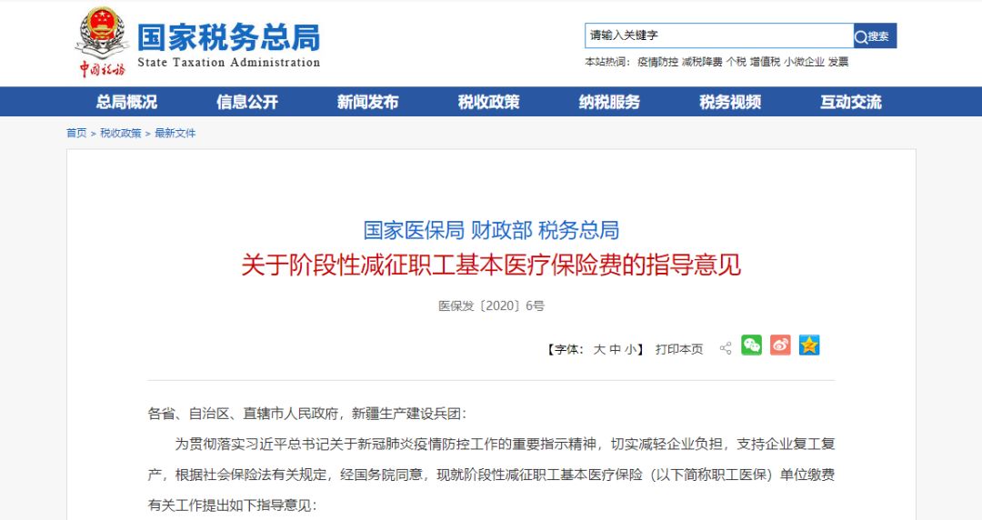 《國家醫(yī)保局Q94;財政部Q94;稅務(wù)總局關(guān)于階段性減征職工基本醫(yī)療保險費(fèi)的指導(dǎo)意見》(醫(yī)保發(fā)〔2020〕6號)